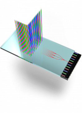Using Direct Laser Writing, we fabricate micro-scale optical light channels (waveguides) directly within the glass. These channels create intricate optical networks that efficiently distribute light within the glass chip.